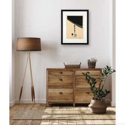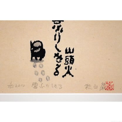 山頭火の俳句が、木版画の温もりある表現と見事に調和し、静寂の中に人生の機微を浮かび上がらせています。簡素な構図ながら、深く心に響く情景が広がります。